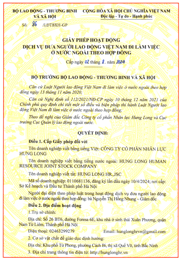 Công ty cổ phần nhân lực Hưng Long được thành thành lập vào ngày 26/4/2024, hoạt động trong lĩnh vực chính: Xuất khẩu lao động, Tư vấn du học, Đào tạo ngoại ngữ và Tư vấn đầu tư với thị trường trọng tâm là Đài Loan.