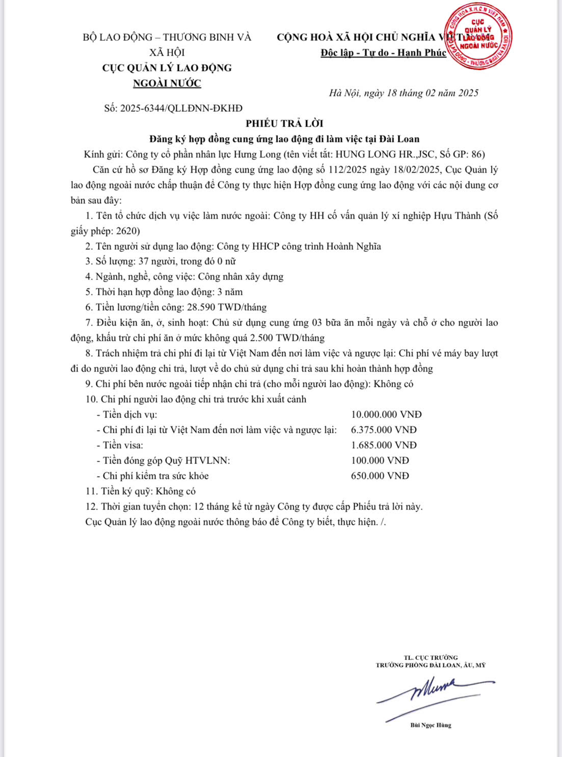 CÁC ĐƠN HÀNG ĐÃ ĐƯỢC CỤC QLLĐNN PHÊ DUYỆT CHO CTY CỔ PHẦN NHÂN LỰC HƯNG LONG
